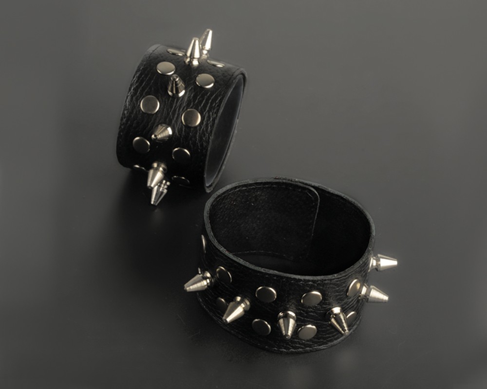 ффектные кожаные напульсники могут использоваться в ролевых играх, украшая запястья, как доминанта, так и сабмиссива. Но самые смелые и дерзкие, бросающие вызов обыденности, могут использовать напульсники в повседневной жизни, для формирования определённого образа. Напульсники выполнены из высококачественной натуральной кожи, чёрного цвета. С внутренней стороны, используется велюровая подклада, бархатистая и приятная на ощупь. Вся фурнитура, которая используется в изделии, , ,никелирована, поэтому блеск металла будет радовать продолжительный период времени. Высота шипов 12 мм. Отрегулировать напульсники по размеру, можно при помощи кнопок. Размер универсальный.