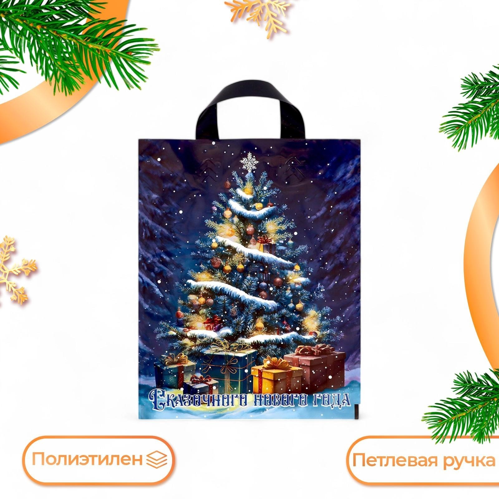 Полиэтиленовый пакет ",Ёлочка с подарками", – это яркий и практичный аксессуар для праздничной упаковки подарков. Он выполнен из прочного полиэтилена с плотностью 50 мкм, что делает его надежным и долговечным вариантом для переноски подарков и новогодних сувениров.Яркий дизайн: изображение нарядной ёлки, окруженной подарками, создает праздничное настроение и идеально подходит для Нового года и Рождества.Прочные петлевые ручки: удобные ручки выдерживают вес содержимого, обеспечивая комфорт при переноске.Надежность материала: плотность 50 мкм гарантирует стойкость к повреждениям, так что пакет выдержит даже увесистые подарки.С размерами 28 x 35 см, этот пакет подойдет для упаковки небольших и средних подарков. Это удачное решение для тех, кто хочет создать новогоднее настроение и подчеркнуть внимание к оформлению подарка.