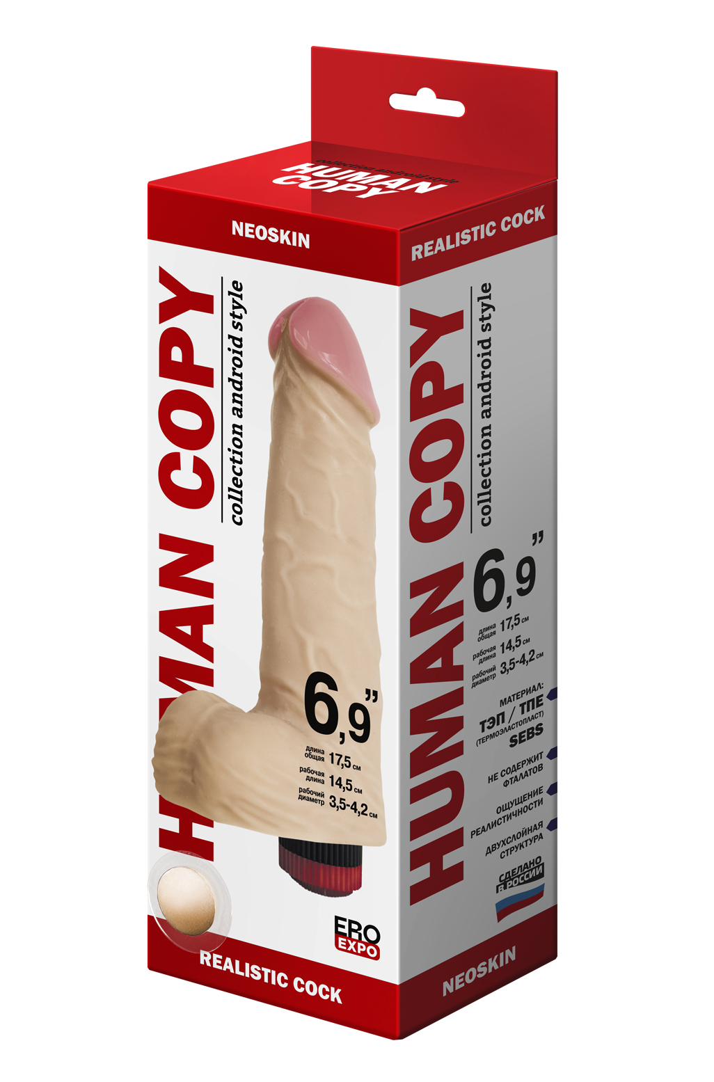 Общая длина в мм 175Рабочая длина в мм 145Диаметр в мм 42Диаметр головки в мм 35Цвет ТелесныйМатериал НеоскинВибрация изделия ДаЛиния товара HUMAN COPYВысота упаковки, мм 65Длина упаковки, мм 280Ширина упаковки, мм 100Вес нетто 0.28Вес брутто 0.37Вибромассажёр HUMAN COPYРеализм до мелочей. Как живой.Вибромассажёр HUMAN COPY создан для тех, кто ценит максимальное сходство с натуральным фаллосом — как внешне, так и по ощущениям. Все модели данной серии очень правдоподобные: от бархатистой текстуры кожи до естественной упругости при изгибе.Гибкий корпус с встроенным вибромеханизмом обеспечивает плавные движения и управляемую вибрацию — вы сами выбираете уровень возбуждения.Основные характеристики:• Цвет: телесный (,кожа), — усиливает эффект естественности• Материал: Neoskin —разработка, имитирующая живую плоть, безопасная для кожи• Максимальная реалистичность — форма и структура полностью повторяют биологический прототип.• Нежная поверхность — тонкая, мягкая оболочка имитирует живую кожу, а складки выглядят и ощущаются естественно.• Гелевая головка — особенно мягкая, усиливает ощущения и делает контакт максимально комфортным.• Полужёсткий каркас — обеспечивает умеренную гибкость и устойчивость, как при естественной эрекции.• Форма: Средние размеры, аккуратная головка, естественный рельеф• Мошонка: в наличии — добавляет к образу и стимуляции чувствительных зонТехнологии и материалы• Изготовлен по технологии медицинского протезирования с применением композитной структуры:• Верхний слой — сверхмягкий материал Neoskin, гипоаллергенный и приятный на ощупь,• Внутренний каркас — эластичный полимер, обеспечивающий форму и устойчивость.• Разработка и авторское право: LOVETOY®Функциональные особенности• Сильная вибрация — сосредоточена в центральной части для усиленной стимуляции.• Источник питания: работает от 2 батареек АА (,не входят в комплект),.Упаковка и презентация• Изделие поставляется в жёсткой коробке из микрогофрокартона с вставленным в специальное окно пробником материала — обеспечивает сохранность товарного вида при транспортировке и удобную демонстрацию текстуры.Для кого этот фаллоимитатор?• Для тех, кто хочет ощутить контакт, как с живым человеком• Для пар, желающих усилить интимную связь через новые ощущения• Для пользователей, экспериментирующих с формами, БДСМ и ролевыми играми• Для коллекционеров — настоящий шедевр реалистичного дизайнаHUMAN COPY — выбор тех, кто хочет больше, чем игрушка. Это почти живое присутствие. Реалистичность, мощная вибрация и продуманная конструкция в одном устройстве.Как использовать:• Перед первым применением мойте теплой водой с мылом.• Используйте водную смазку — она совместима с материалом и снижает риск дискомфорта.• После использования — тщательно мойте и просушивайте в тени.• Храните в сухом месте, избегая деформации.• Можно использовать с презервативом — для гигиеничного применения.