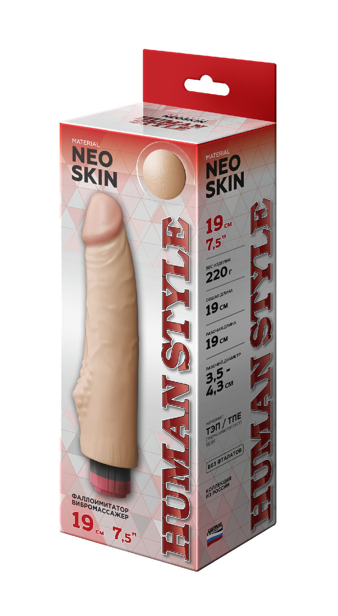 Общая длина в мм 190Рабочая длина в мм 190Диаметр в мм 43Диаметр головки в мм 35Цвет ТелесныйМатериал НеоскинВибрация изделия ДаЛиния товара HUMAN STYLEВысота упаковки, мм 60Длина упаковки, мм 250Ширина упаковки, мм 95Вес нетто 0.217Вес брутто 0.297 Вибромассажёр HUMAN COPYРеализм до мелочей. Как живой.Вибромассажёр HUMAN COPY создан для тех, кто ценит максимальное сходство с натуральным фаллосом — как внешне, так и по ощущениям. Все модели данной серии очень правдоподобные: от бархатистой текстуры кожи до естественной упругости при изгибе.Гибкий корпус с встроенным вибромеханизмом обеспечивает плавные движения и управляемую вибрацию — вы сами выбираете уровень возбуждения.Основные характеристики:• Цвет: телесный (,кожа), — усиливает эффект естественности• Материал: Neoskin —разработка, имитирующая живую плоть, безопасная для кожи• Максимальная реалистичность — форма и структура полностью повторяют биологический прототип.• Нежная поверхность — тонкая, мягкая оболочка имитирует живую кожу, а складки выглядят и ощущаются естественно.• Гелевая головка — особенно мягкая, усиливает ощущения и делает контакт максимально комфортным.• Полужёсткий каркас — обеспечивает умеренную гибкость и устойчивость, как при естественной эрекции.• Форма - классическая, повторяющая контуры мужского фаллоса, с немного увеличенной головкой для усиленной стимуляции точки G.• Ствол имеет бугорок в нижней части, для более сильной стимуляции.Технологии и материалы• Изготовлен по технологии медицинского протезирования с применением композитной структуры:• Верхний слой — сверхмягкий материал Neoskin, гипоаллергенный и приятный на ощупь,• Внутренний каркас — эластичный полимер, обеспечивающий форму и устойчивость.• Разработка и авторское право: LOVETOY®Функциональные особенности• Сильная вибрация — сосредоточена в центральной части для усиленной стимуляции.• Источник питания: работает от 2 батареек АА (,не входят в комплект),.Упаковка и презентация• Изделие поставляется в жёсткой коробке из микрогофрокартона с вставленным в специальное окно пробником материала — обеспечивает сохранность товарного вида при транспортировке и удобную демонстрацию текстуры.Для кого этот фаллоимитатор?• Для тех, кто хочет ощутить контакт, как с живым человеком• Для пар, желающих разнообразить интимную жизнь через новые практики• Для пользователей, экспериментирующих с формами, БДСМ и ролевыми играми• Для коллекционеров — шедевр в категории реалистичных изделийHUMAN COPY — выбор тех, кто хочет больше, чем игрушка. Это почти живое присутствие. Реалистичность, мощная вибрация и продуманная конструкция в одном устройстве.Как использовать:• Перед первым применением мойте теплой водой с мылом.• Используйте водную смазку — она совместима с материалом и снижает риск дискомфорта.• После использования — тщательно мойте и просушивайте в тени.• Храните в сухом месте, избегая деформации.• Можно использовать с презервативом — для гигиеничного применения.
