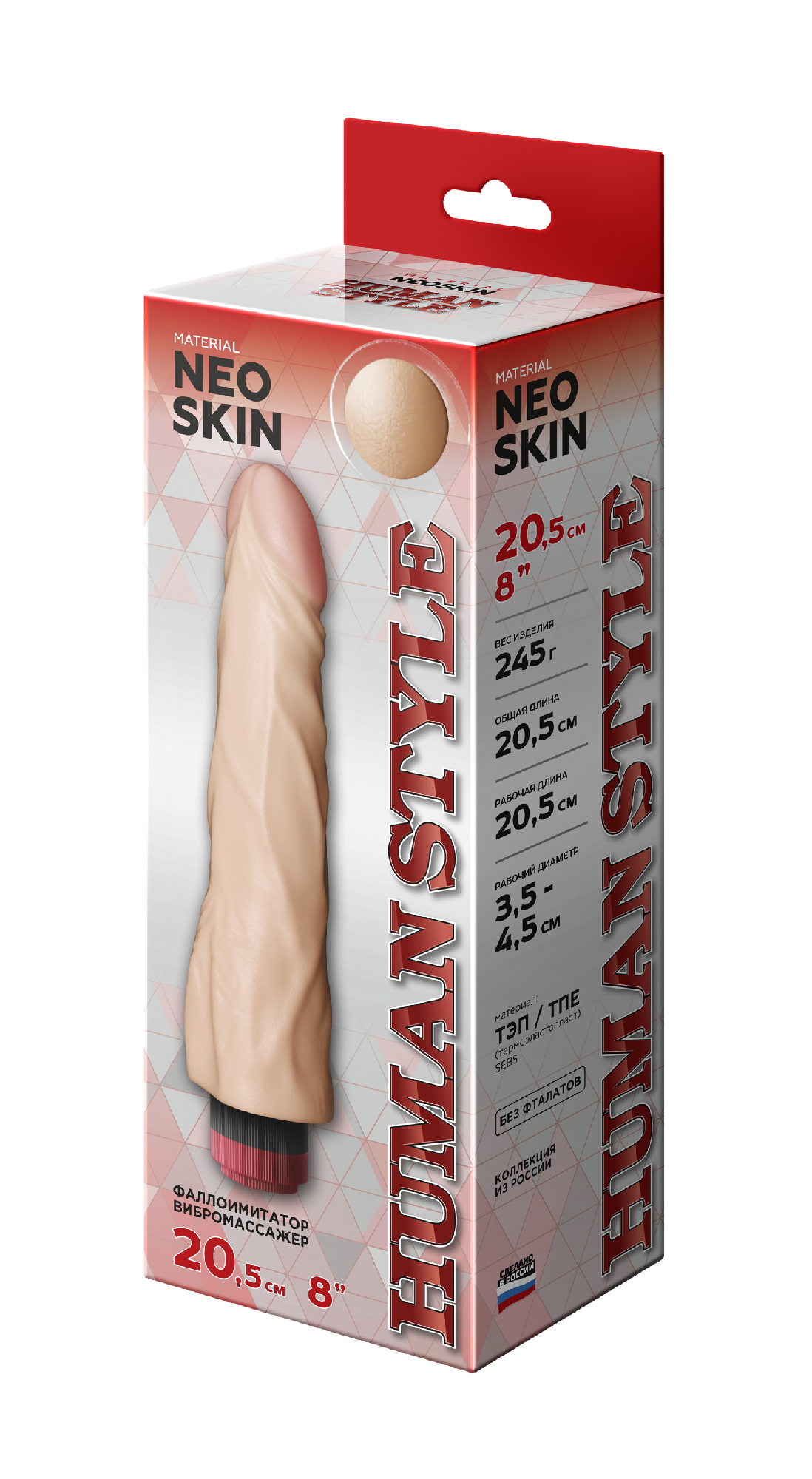Общая длина в мм 205Рабочая длина в мм 205Диаметр в мм 45Диаметр головки в мм 35Цвет ТелесныйМатериал НеоскинВибрация изделия ДаЛиния товара HUMAN STYLEВысота упаковки, мм 60Длина упаковки, мм 250Ширина упаковки, мм 95Вес нетто 0.236Вес брутто 0.316Вибромассажёр HUMAN COPYРеализм до мелочей. Как живой.Вибромассажёр HUMAN COPY создан для тех, кто ценит максимальное сходство с натуральным фаллосом — как внешне, так и по ощущениям. Все модели данной серии очень правдоподобные: от бархатистой текстуры кожи до естественной упругости при изгибе.Гибкий корпус с встроенным вибромеханизмом обеспечивает плавные движения и управляемую вибрацию — вы сами выбираете уровень возбуждения.Основные характеристики:• Цвет: телесный (,кожа), — усиливает эффект естественности• Материал: Neoskin —разработка, имитирующая живую плоть, безопасная для кожи• Максимальная реалистичность — форма и структура полностью повторяют биологический прототип.• Нежная поверхность — тонкая, мягкая оболочка имитирует живую кожу, а складки выглядят и ощущаются естественно.• Гелевая головка — особенно мягкая, усиливает ощущения и делает контакт максимально комфортным.• Полужёсткий каркас — обеспечивает умеренную гибкость и устойчивость, как при естественной эрекции.• Форма - классическая, повторяющая контуры мужского фаллоса, с немного увеличенной головкой для усиленной стимуляции точки G.• Конусообразный ствол - постепенно расширяется книзу — обеспечивает плавное проникновение и интенсивную стимуляцию.Технологии и материалы• Изготовлен по технологии медицинского протезирования с применением композитной структуры:• Верхний слой — сверхмягкий материал Neoskin, гипоаллергенный и приятный на ощупь,• Внутренний каркас — эластичный полимер, обеспечивающий форму и устойчивость.• Разработка и авторское право: LOVETOY®Функциональные особенности• Сильная вибрация — сосредоточена в центральной части для усиленной стимуляции.• Источник питания: работает от 2 батареек АА (,не входят в комплект),.Упаковка и презентация• Изделие поставляется в жёсткой коробке из микрогофрокартона с вставленным в специальное окно пробником материала — обеспечивает сохранность товарного вида при транспортировке и удобную демонстрацию текстуры.HUMAN COPY — выбор тех, кто хочет больше, чем игрушка. Это почти живое присутствие. Реалистичность, мощная вибрация и продуманная конструкция в одном устройстве.Как использовать:• Перед первым применением мойте теплой водой с мылом.• Используйте водную смазку — она совместима с материалом и снижает риск дискомфорта.• После использования — тщательно мойте и просушивайте в тени.• Храните в сухом месте, избегая деформации.• Можно использовать с презервативом — для гигиеничного применения.